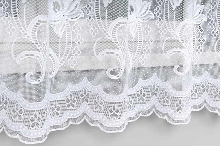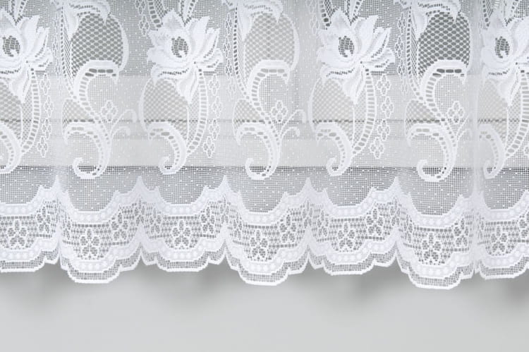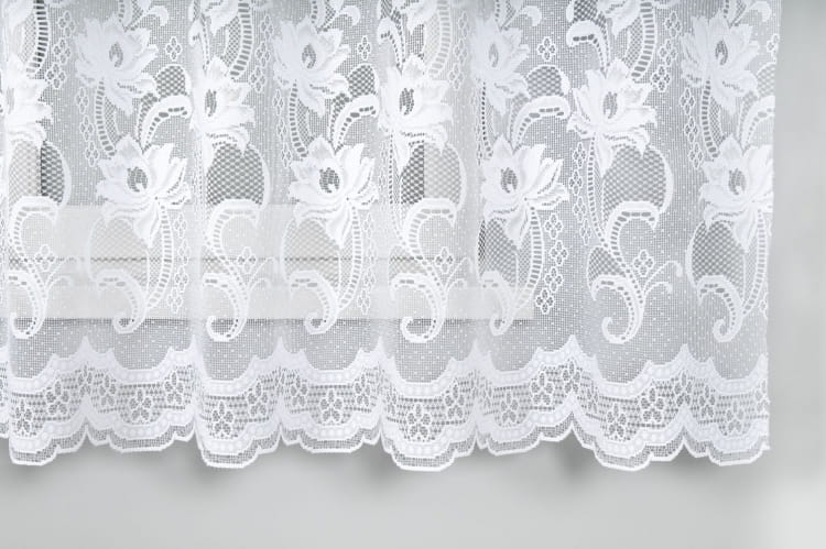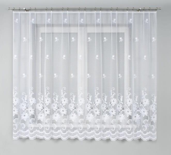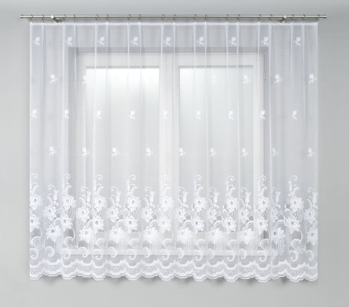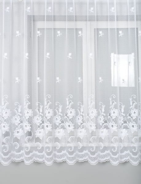 Firanka żakardowa z przędzy nabłyszczanej z szerokim wzorem szlakowym i delikatnymi kwiatuszkami.Dostępna 1 szt.