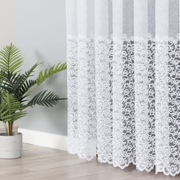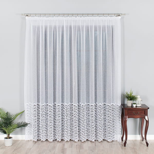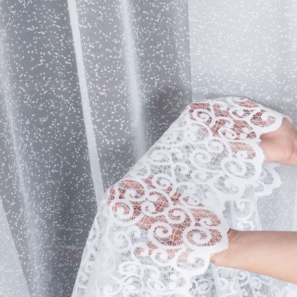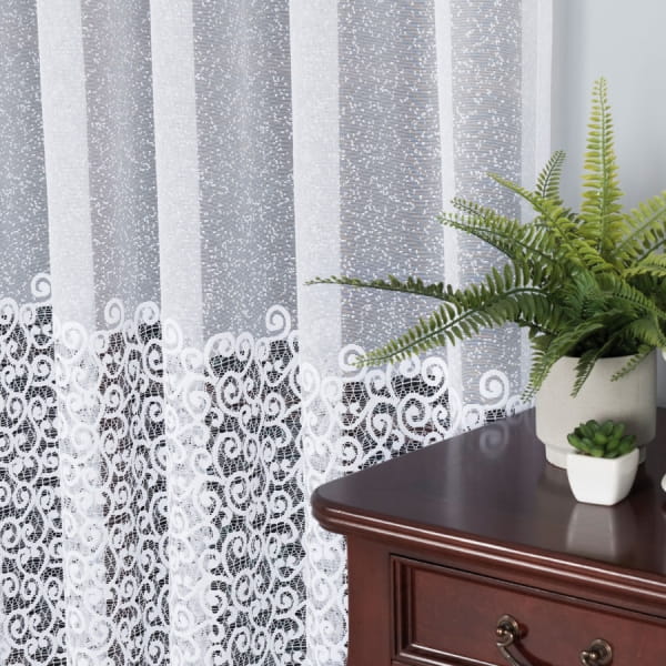 Firanka żakardowa na gęściejszej siatce żakardowej z ozdobnym szlakiem imitującym gipiurę do wysokości 55 cm