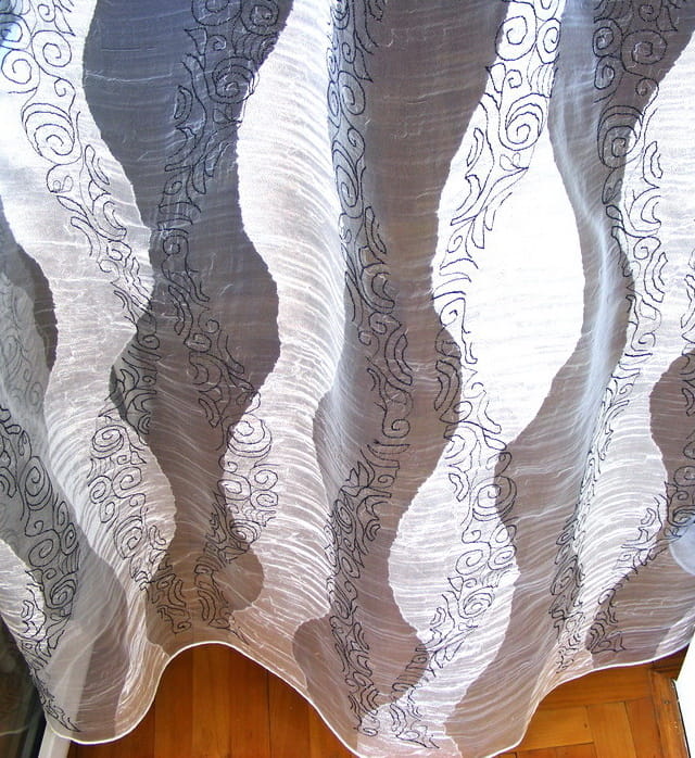 Wyjątkowo oryginalna organtyna kreszowana z przegęszczonymi białymi pasami, na przerzedzonym pasie wyszywane są czarne różyczki, doskonale nadaje się do nowoczesnych wnętrz.